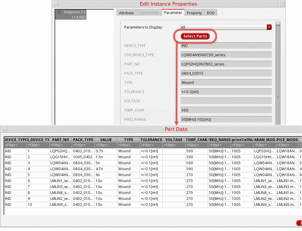 SMD components are found in the smdLib, a library created by importing SMD components from a CSV file. It is designed to be used in conjunction with a part table file (*.ptf) that lists the available components and their associated electrical characteristics and other useful information provided by the component manufacturer. The Select Parts button in the Edit Object Properties form displays the most useful electrical information of each individual SMD footprints. For example, for an inductor, it displays the inductance, Q or quality factor, self-resonance frequency, and tolerance. In addition, an associated S-parameter model file to be used for simulation is mentioned. Models are obtained from the manufacturer and their names are stored in the PTF.