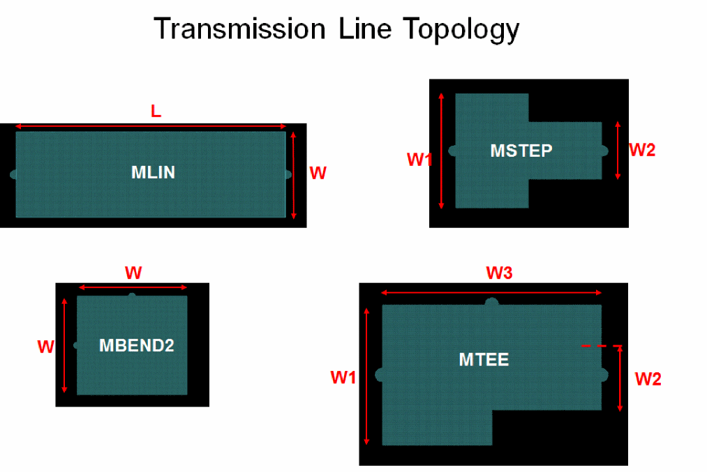 rfTlineLib includes an interactive graphical stack-up editor for storing the substrate geometry and material properties. The TLine topologies that are used as TILPs in the Virtuoso RF Solution are shown in this illustration.