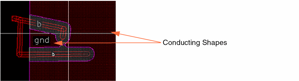 The void generator smooths the conducting shapes that result from voiding. This smoothing is required for manufacturing ability of the design. Sharp corners (of angles lower than 90 degrees) are rounded and the pkgMinAperture constraint is enforced. Void generation might split a dynamic shape into multiple conducting shapes or “islands,” as shown in the following image: