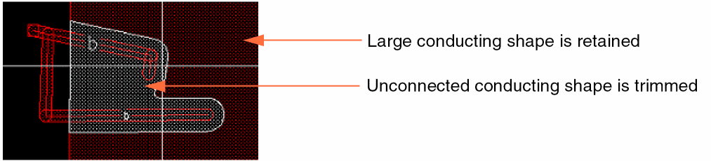 Use the voidGeneratorTrimUnconnectedShapes environment variable to control trimming of unconnected conducting shapes. The default value is t. In this state, the unconnected conducting shapes are trimmed, as shown below. The small conducting shape is trimmed out because it is not connected to any pin. The large conducting shape is retained because either it is connected to a pin or it is the largest conducting shape.