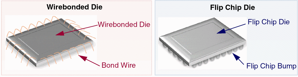 - Wirebonded die: Uses bond wires to establish connections. Bond wires are connected to the die IO pads on one side and the bond wire endpoints or bond fingers on the other.