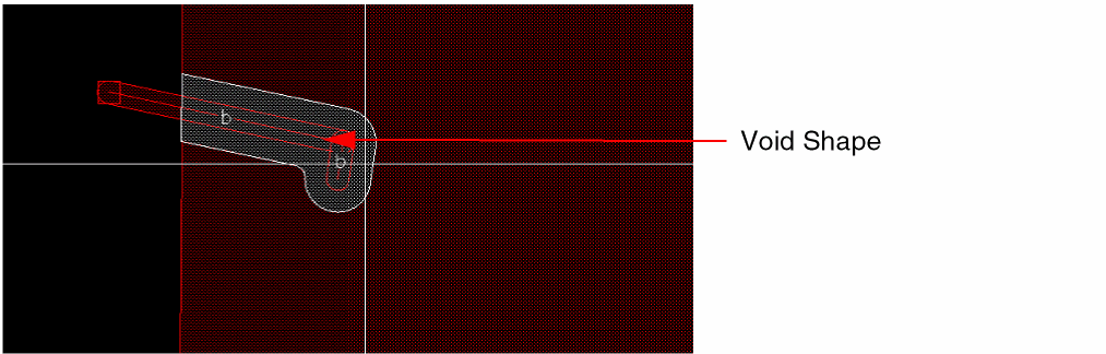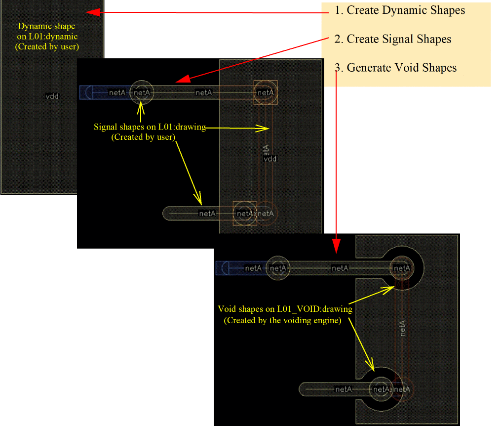 For each dynamic shape on (layer dynamic), the void generator searches for overlapping signal shapes in (layer drawing). The generator creates void shapes on (<layer>_VOID drawing) for shapes on different nets. In other words, if the nets of the dynamic and signal shapes are different, the void generator effectively removes parts of metal around the signal shape. The conducting shapes, which are the metal shapes left after removing the void shapes from the dynamic shapes, are the effective metal shapes that will be manufactured.