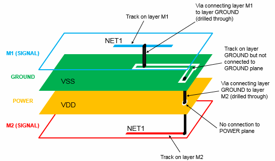 In this example, a via connects layers M1 and GROUND; a second via connects layers GROUND, POWER, and M2. Voids are generated around the vias and paths in layer GROUND and around the via on layer POWER to insulate the NET1 signal from the respective planes.