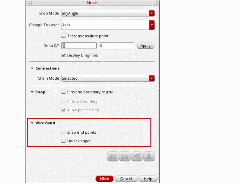 F3to display the Move form. In addition to the standard Move options, the form includes a Wire Bond section. Select Snap end points to specify the snapping behavior of bond wires. The snapping behavior differs based on the selection.- If the IO side of a bond wire is selected, the endpoint is snapped to the same net IOs.