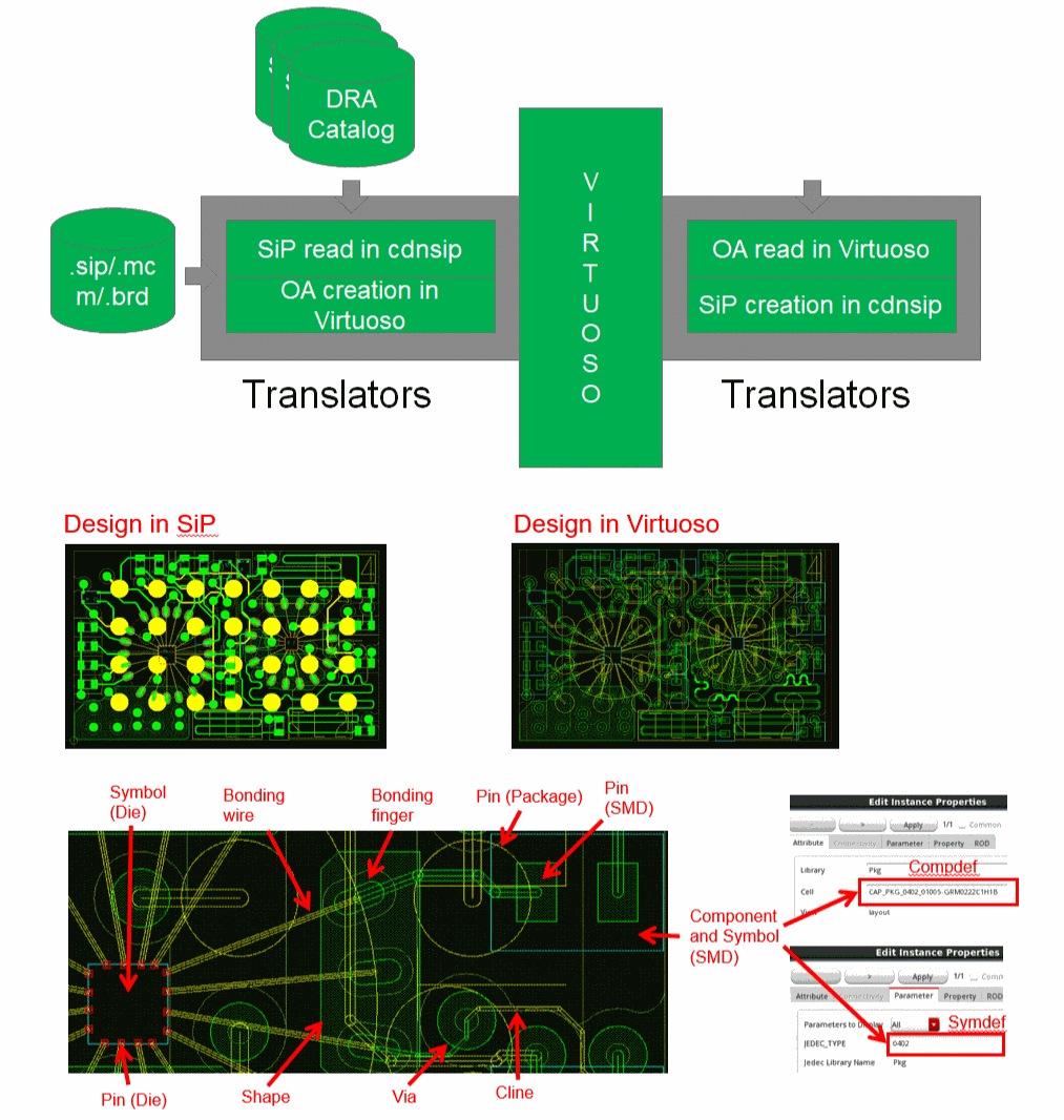 Due to the differences in the underlying SiP and OA databases, the object representations in SiP and OA are sometimes not entirely equivalent. Once the object has been translated from SiP to OA, it might not restore to its original SiP representation from the OA representation. Consequently, the translation of a SiP design to OA and back to SiP might be different from the original one. However, the physical layouts created from the two design representations are equivalent from the manufacturing and analysis point of view up to a certain tolerance.