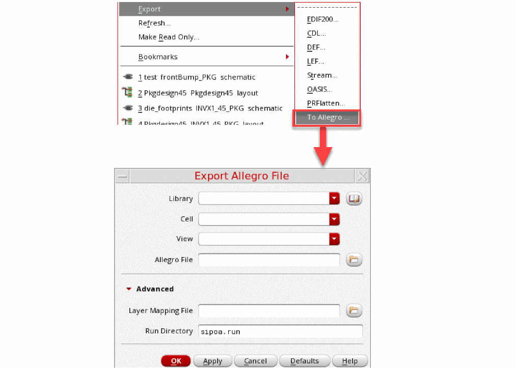 When exporting the package layout, the Allegro translator creates a .sip file from the OA library (specified cellview) that has been created or modified to ensure it has the same structure.