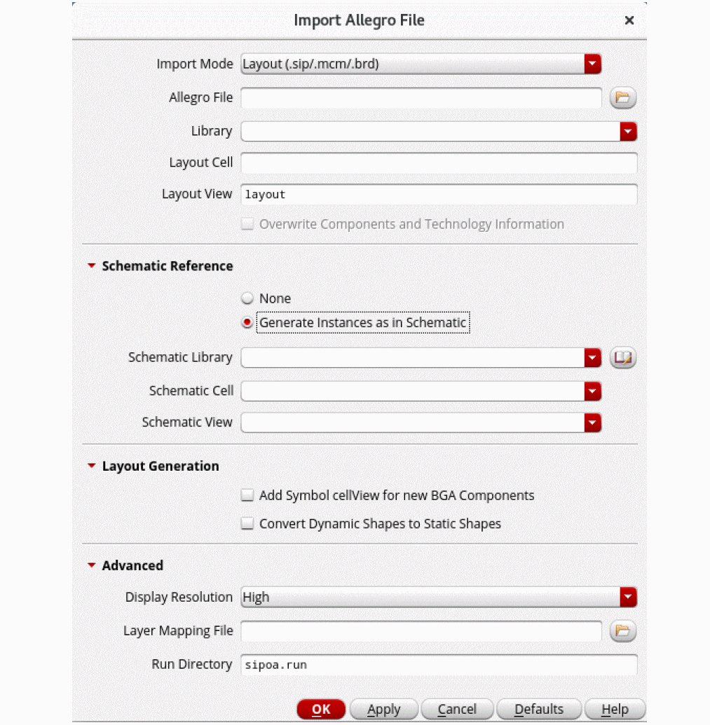 - Specify Import Mode, Allegro File, and Library. The Layout Cell and Layout View fields get populated automatically.