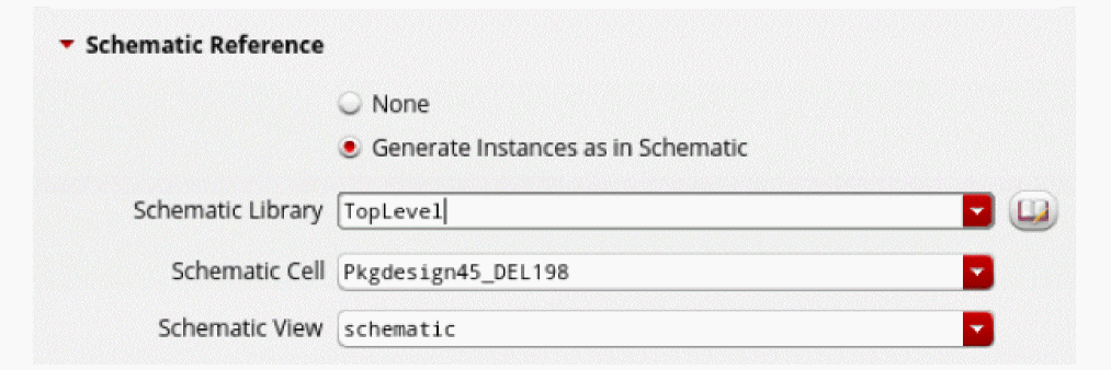 This sets the reference for the top-level layout to the specified package schematic. The package schematic and top-level layout are bound to each other.