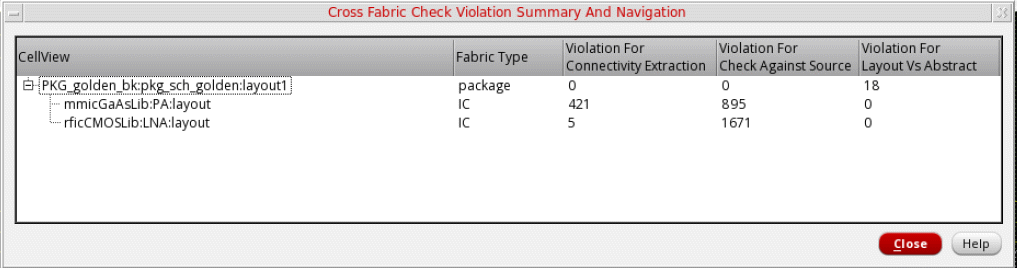 Expand the package view in the CellView column to view a list of cellviews in which violations are reported. Fabric Type specifies the fabric type of the cellviews.