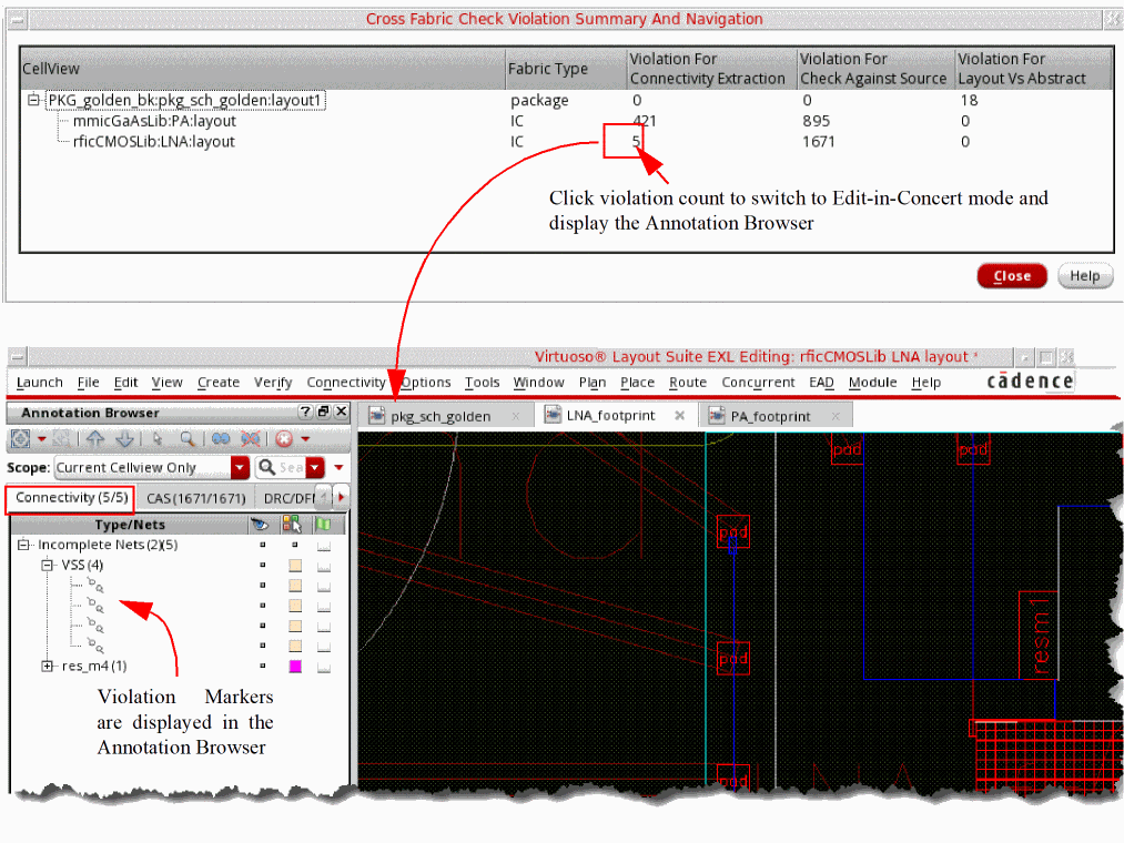Click a violation count to open the corresponding die in the foreground in Edit-in-Concert mode. The Annotation Browser is displayed with the corresponding tab open. For example, if you click the Violation for Connectivity Extraction count, the Connectivity tab is displayed.