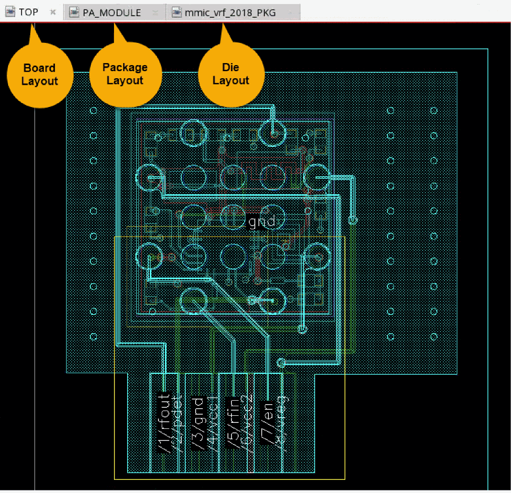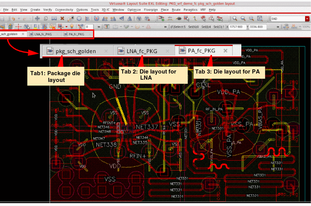 In the following example, the given package die includes two TILPs, LNA and PA. In Edit-in-Concert mode, the package die layout is displayed on the first tab and the die layouts for the two TILPs are displayed on separate tabs.