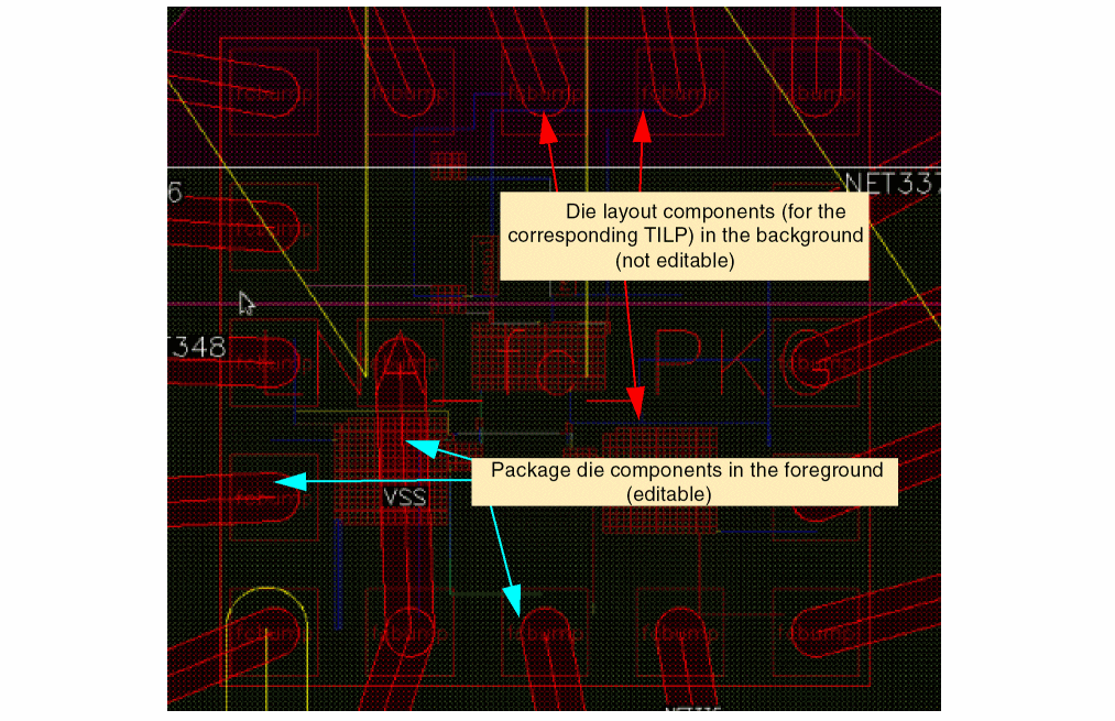 Here is zoomed-in image of the above design, which shows the package die in the foreground (editable) and the die layout corresponding to the TILP in the background (not editable). The zoom settings are propagated across the dies open in Edit-in-Concert mode.