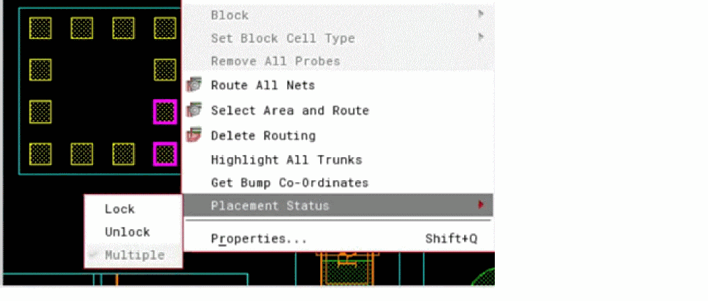 You can view or set the placement status of IOs as Lock or Unlock using the Placement Status menu item. The menu item appears in the context menu when you select an IO or an instance. If the selected IO is locked, the Lock option appears selected in the sub-menu. Similarly, the Unlock option appears selected if the selected IO is unlocked. If both locked and unlocked IOs are selected in a layout when selecting an instance, the Multiple option appears selected but this is a view-only option. You cannot set this option for IOs.