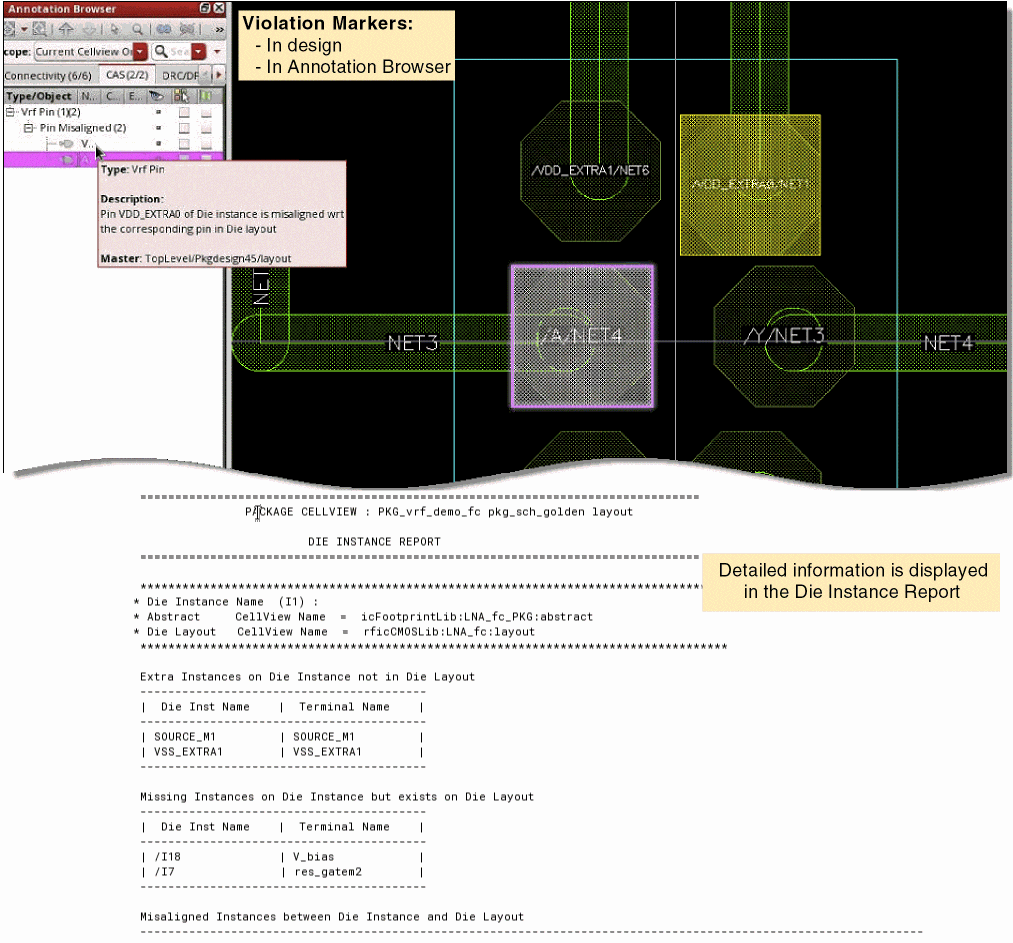 If run from package layout, checking is done between die layout and die abstract. Module fabrics are treated the same way as package fabrics.