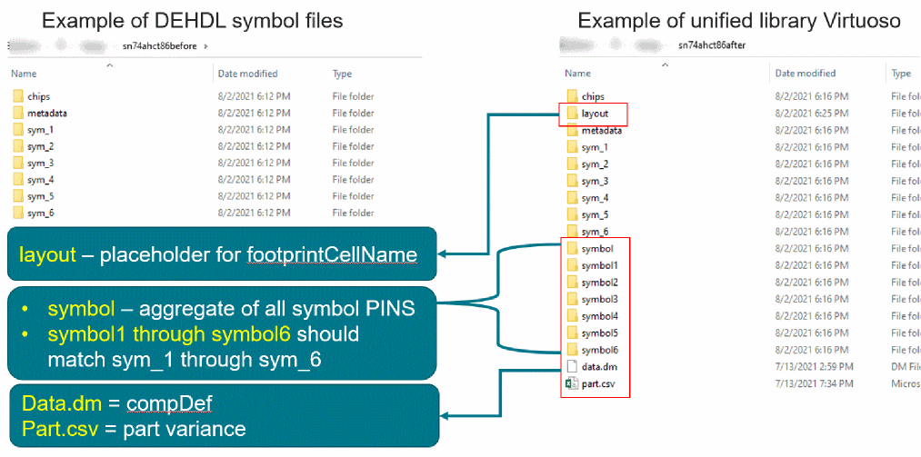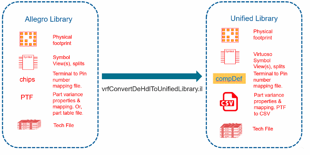Unified libraries are crucial in heterogeneous integration designs to support interoperability across tool boundaries. The data sharing and design exchange for advanced package design flows is simplified through conversion. A single symbol in Allegro platform with a vectorized terminal name A<0> that has 100 pin numbers is transformed to 100 symbols in Virtuoso Studio to maintain traceability.