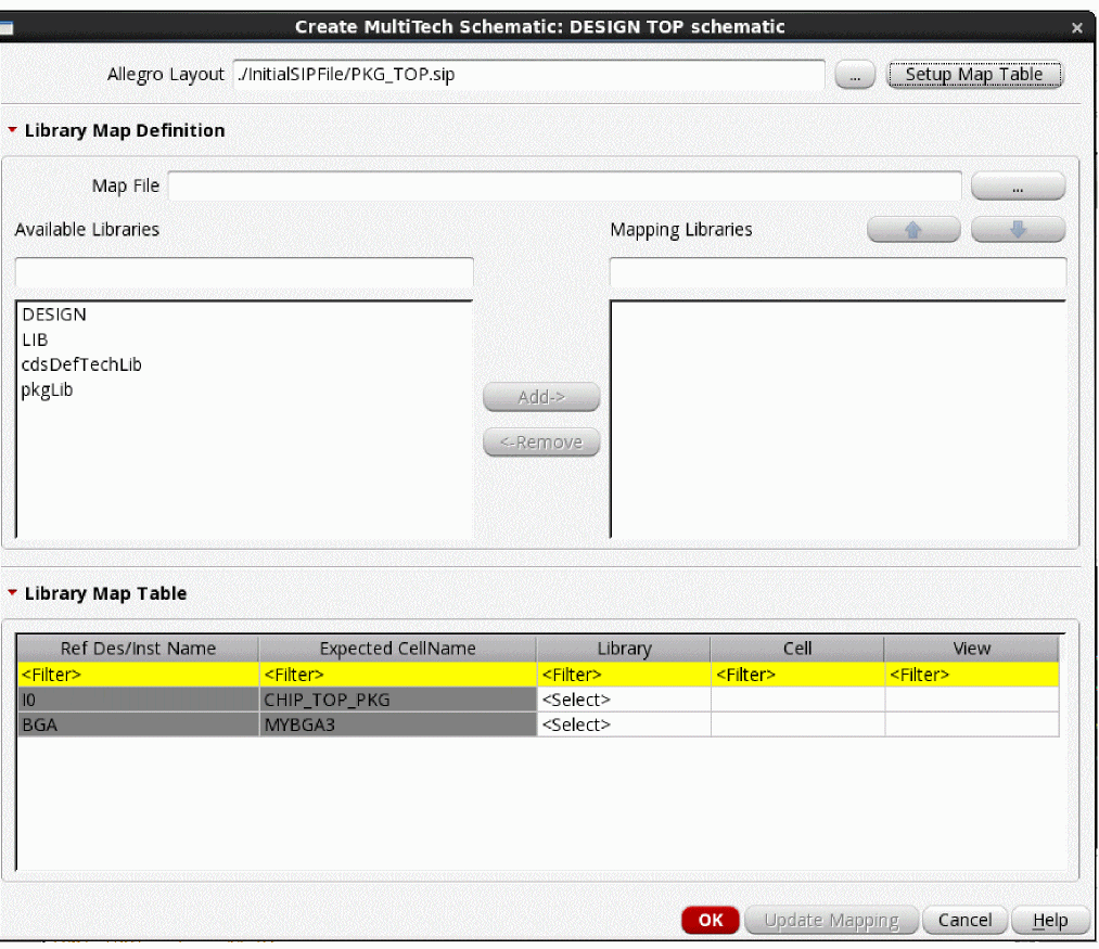 - Click Setup Map Table. The information from the SiP file is loaded in the Library Map Table section. Each instance in the SiP file is added to a separate row in the table.