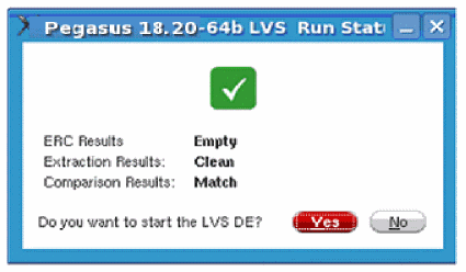 Click Apply. The Pegasus/PVS LVS run starts. At the end of the LVS run, the following window opens. It displays the Comparison Results as Match.