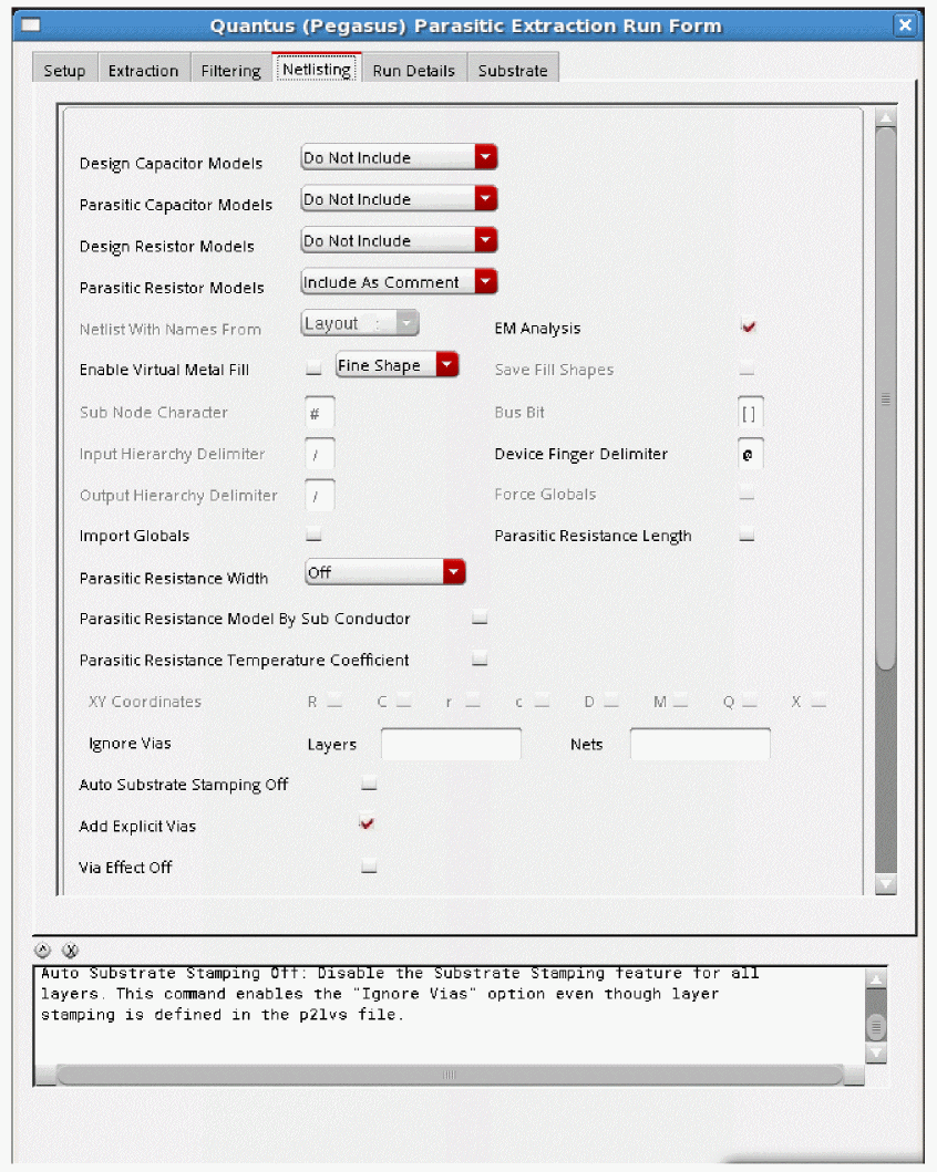 Figure 4-16 Quantus (Pegasus) Parasitic Extraction Run form – Netlisting TabFigure 4-17 Quantus QRC (PVS) Parasitic Extraction Run form – Netlisting Tab