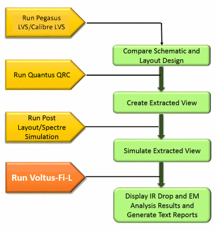 The following sections describe this flow in detail and explain the options to be set for Pegasus/PVS and Spectre for this analysis and the flow for Voltus-Fi-L.