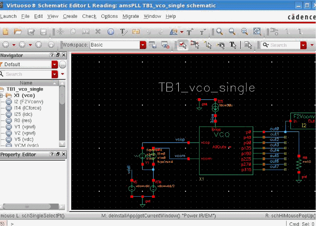 An example of a testbench in Virtuoso® Schematic Editor is shown below.