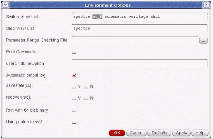 - In the Environment Options form, specify the extracted view in the simulation in the Switch View List field. You can also specify config views. This is shown above in the “Running a Spectre Simulation” section.