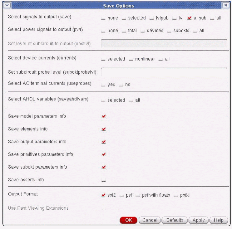 In the Save Options form, ensure that the allpub option is selected. The Save Options dialog box is activated by the Outputs – Save All command. This is shown above in the “Running a Spectre Simulation” section. Only the node voltages are saved during the APS simulation. No