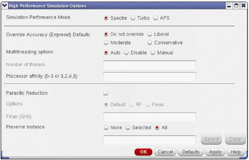 You can perform simulation using the Virtuoso® APS. These simulation results can be used as input to Voltus-Fi-L instead of the simulation results from Virtuoso® Spectre simulator, if required. Virtuoso® APS is a next-generation SPICE simulator that provides high performance, high capacity circuit simulation with full Cadence® Spectre® Circuit Simulator accuracy. APS achieves maximum simulation performance by enabling multi-threading on multi-core and multi-CPU shared memory systems. This simulator lets you simulate large pre- and post-layout designs faster than the Spectre simulator.