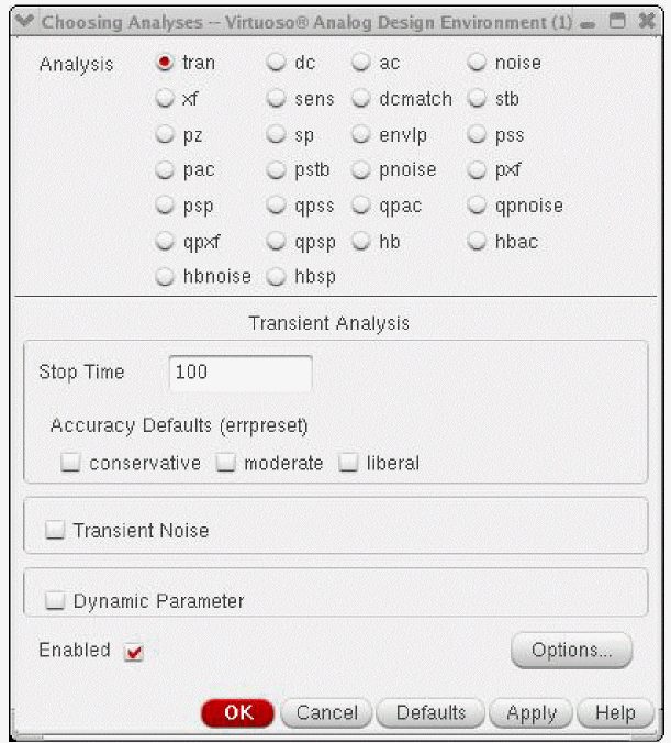 - In the Virtuoso® Analog Design Environment, select Analysis – Choose. The Choosing Analyses form opens.