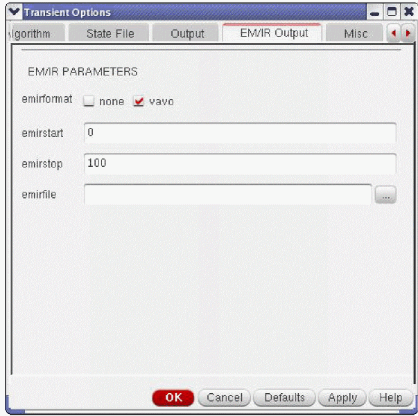- In the Transient Options form, select the EM/IR Output tab. On this tab: