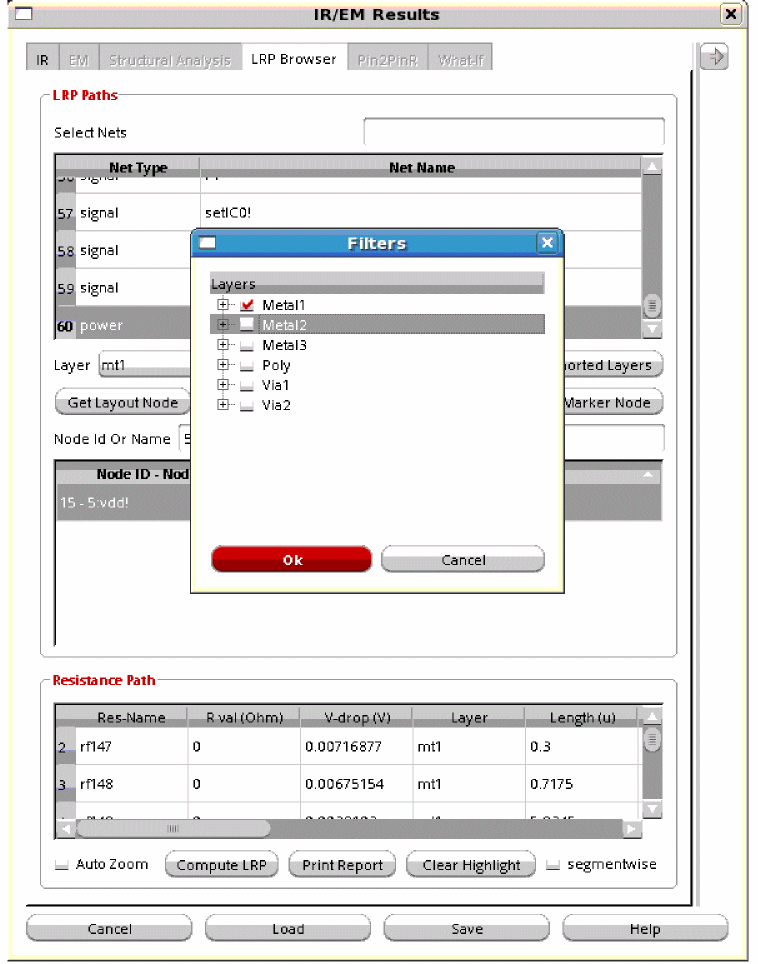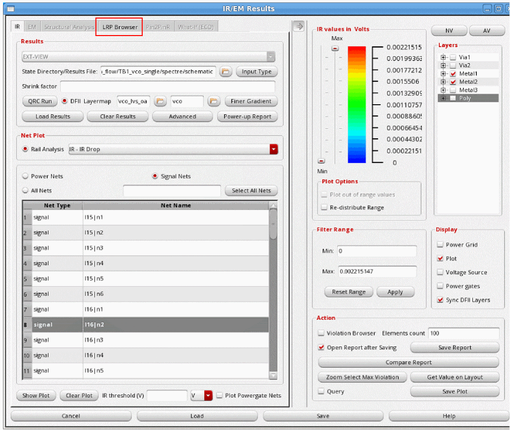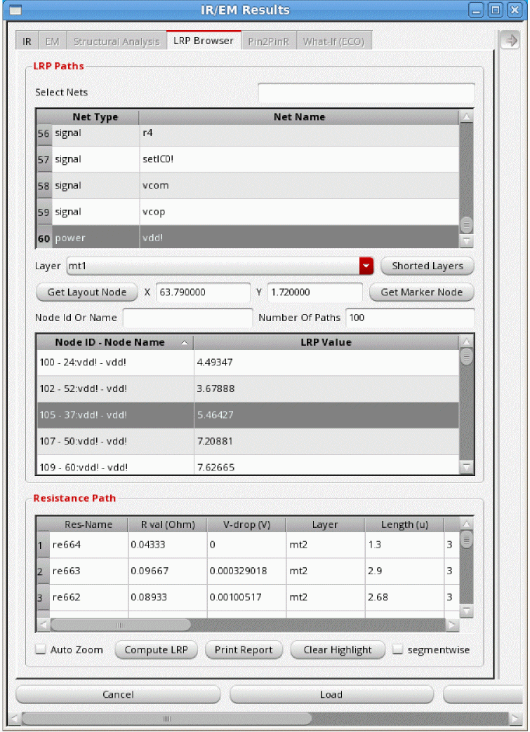 A sample report is shown in RLRP Report in the “IR Drop Analysis” chapter of the Voltus-Fi Custom Power Integrity Solution XL User Guide. - Click Clear Highlight to clear the LRP highlighted on the layout.