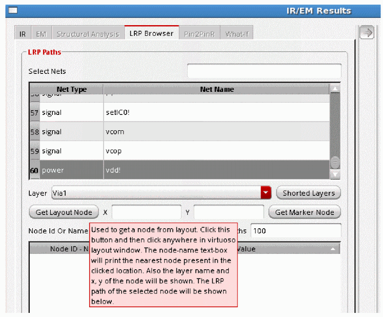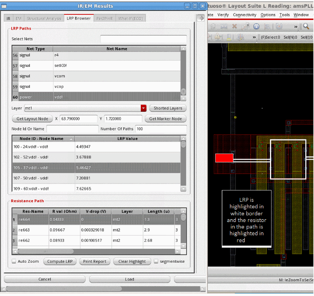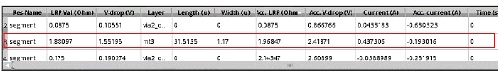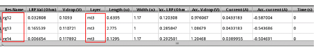 The Resistance Path table lists all the resistors in the LRP path for the node selected in the Node ID - Node Name table. You can click any row to highlight the resistor in the layout window.