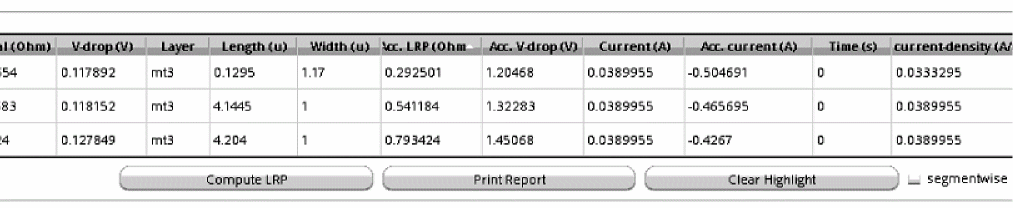 Check segmentwise to view the combined resistance values for a layer in the Resistance Path table. When this option is enabled, all the resistors on a layer, metal or via, will be merged into one segment for the purpose of LRP reporting. In the image below, the resistors,