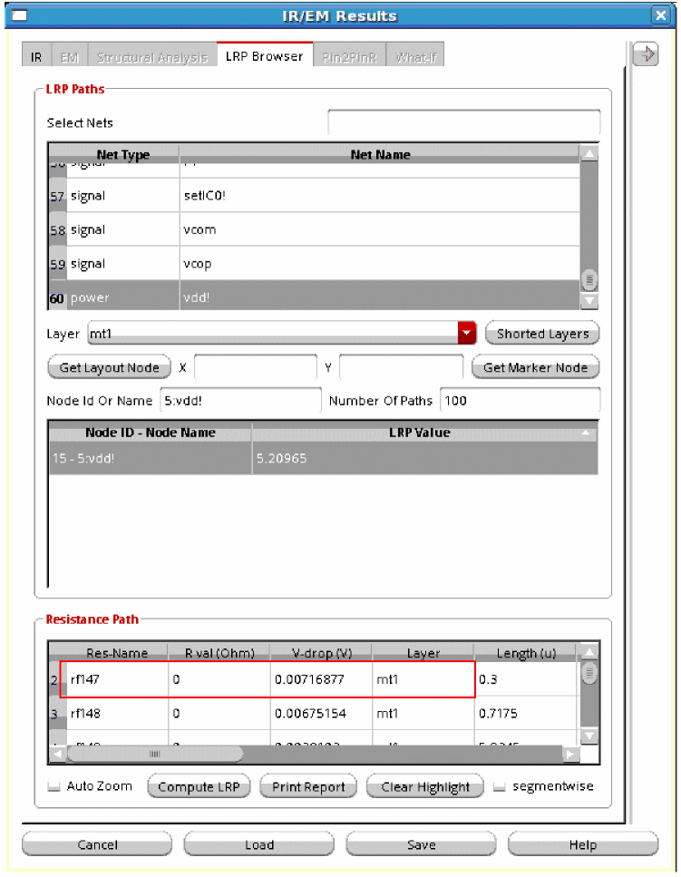 When a layer is shorted, the resistance value information in the Resistance Path group box shows a value of 0 in the R val (Ohm) column for all the resistors on that layer. For example, in the image below, the LRP value for resistor rf147 on layer mt1 is 0.