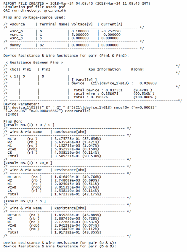 Voltus-Fi-L reports the on-resistance (RON) values for all layers and devices between specified pairs of pins in a design. The software reports the combined resistance contribution of both pins in the pair and the contribution from each pin. The resistance values are reported in ohms.