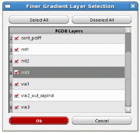 For this, specify the DFII Layermap file and then click the Finer Gradient button provided on the IR or EM tabs of the IR/EM Results form. In the Finer Gradient Layer Selection pop-up, click Deselect All and then select the PGDB layers for which you want to view finer gradient. For details of the steps involved, see