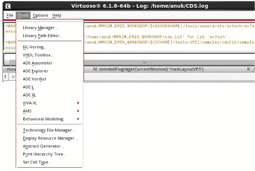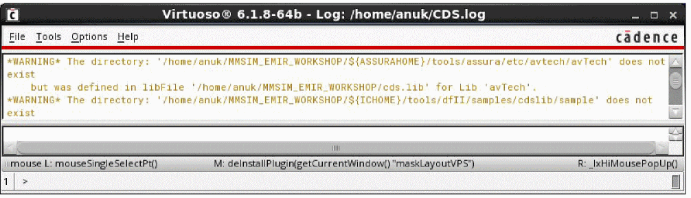 Virtuoso). - The path to the log file (CDS.log) that records the ongoing events of the design session. The content of the log file is displayed in the output area.