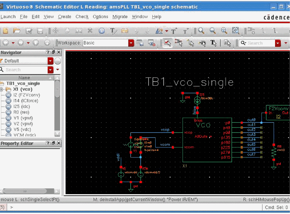 Once you have selected the schematic view, doubleclick the view to open the design in Virtuoso Schematic Editor L. This is shown below.
