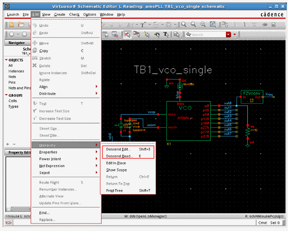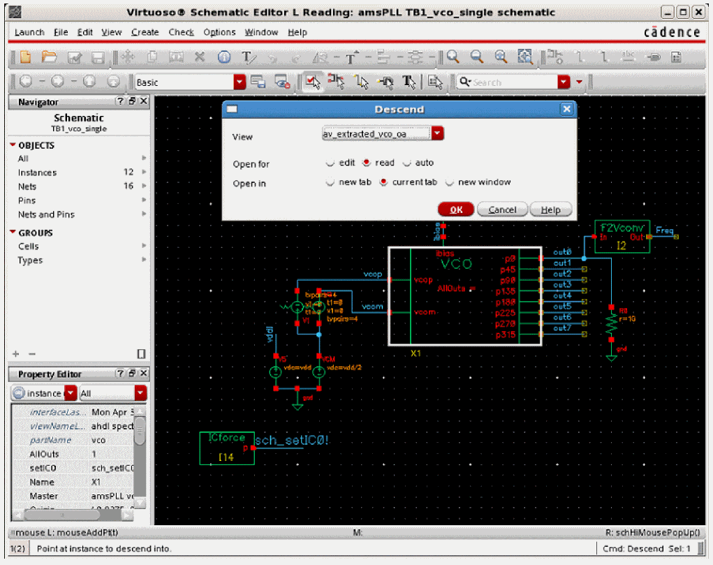In the Schematic Editor, before you run Voltus-Fi-L, you need to descend into the design hierarchy. A design hierarchy consists of many levels of a single design. When you descend into the design hierarchy, you view the extracted layout of the design you want to analyze.