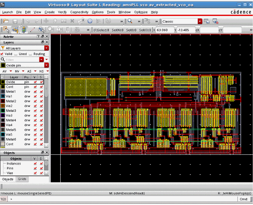 The selected view of the instance opens in Virtuoso® Layout Suite L. This is shown in the figure below.