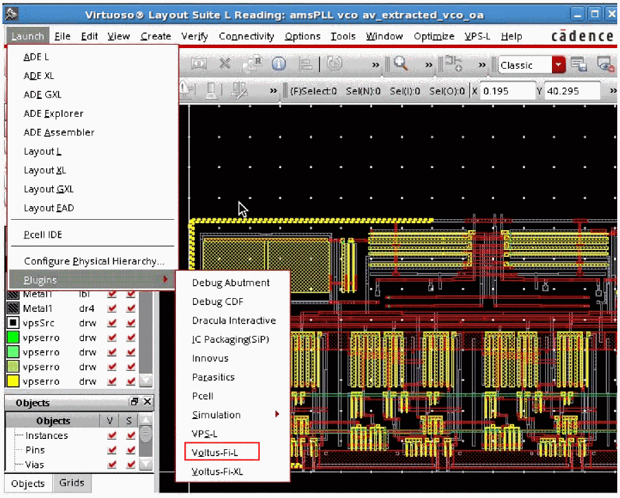 After opening the detailed view of the selected instance of the design, open the Voltus-Fi-L GUI from the Main menu of the Virtuoso® Layout Suite by performing the following steps: