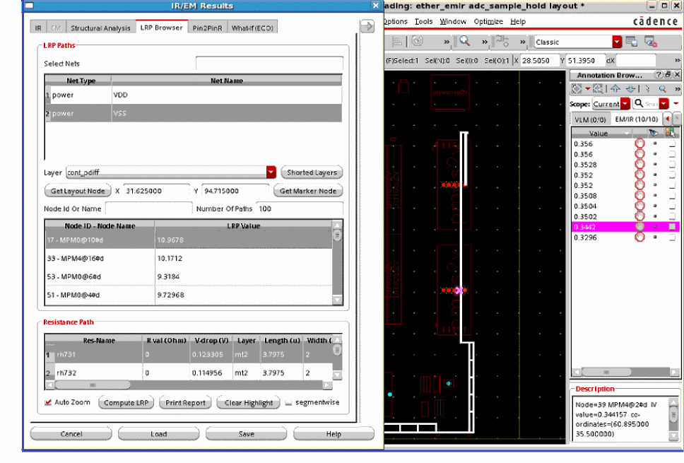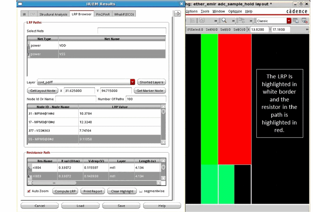 In addition to identifying and displaying the worst IR drop violations, the LRP analysis feature in Voltus-Fi-XL lets you plot LRP on demand for any node. You can view the LRP for any high IR drop node by selecting it in the layout. There are two options provided in the GUI, Get Layout Node and Get Marker Node, to let you select a node on the GUI and view its LRP and to select an object in Annotation Browser and view the LRP for the node on the selected marker.