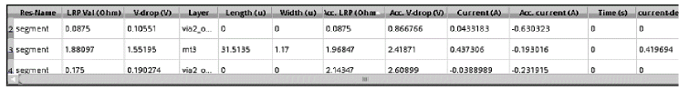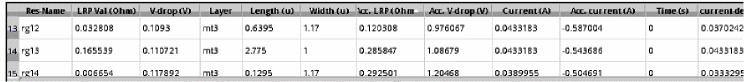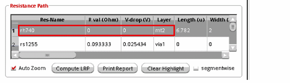 When a layer is shorted, the R val (Ohm) column in the resistance path table shows a value of 0 for all resistors on that layer. In the following example, the LRP value for resistor, rh740 on shorted layer, mt2 is 0.