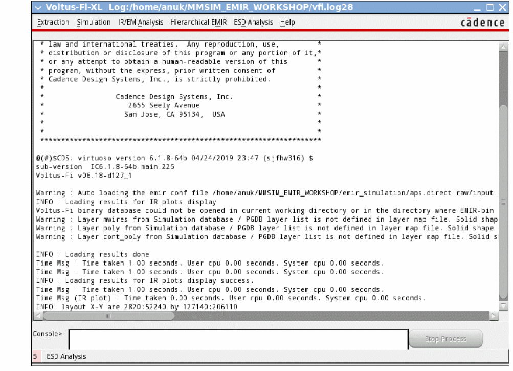 The following main menus of Voltus-Fi-XL are available. In addition to the menus, there is a Stop Process button in the console. This button is enabled when you run a process. Click this button to stop a process while it is running.