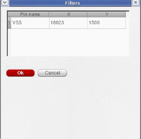 The show pins button is enabled. Click this button to view the list of pins on the selected layer. The Filters pop-up opens. The pin name and the x- and y- coordinates of the pin are provided in the pop-up. Select the row and click OK. The pin name and its coordinates appear in the table. This is shown below.