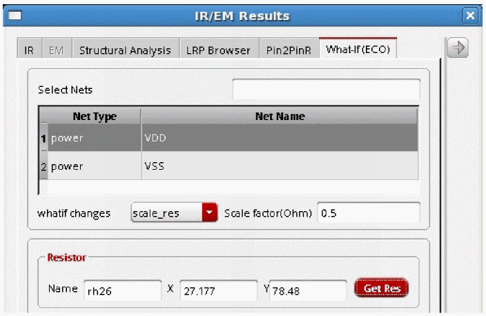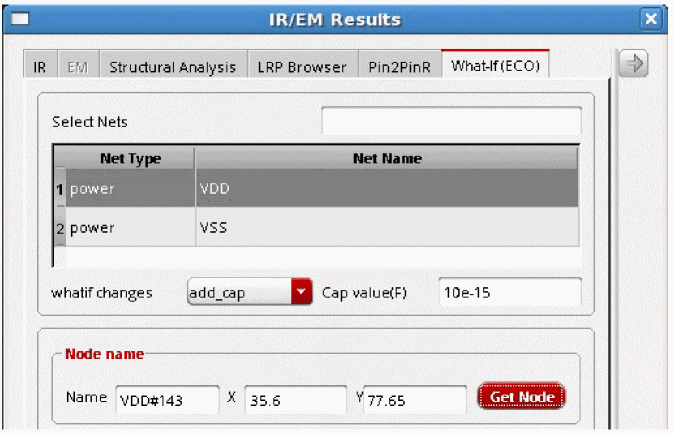 The fields on the What-If (ECO) tab are the same as described above and shown in Figure 10-2. For details, see Performing What-If (ECO) Analysis in Voltus-Fi-XL. -