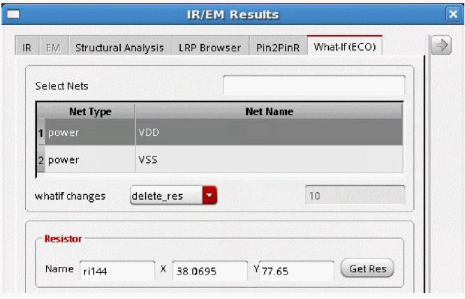 V*, the table will list all nets whose names start withV, for exampleVDDandVSS. - From the whatif changes list, select the ECO command you want to run. The following commands are available:
