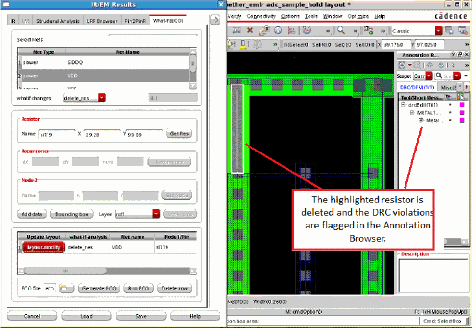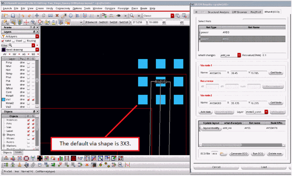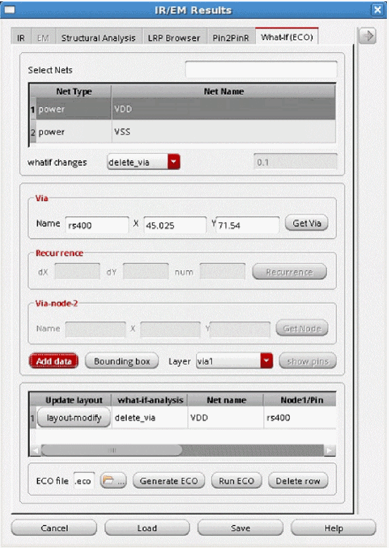 Voltus-Fi-XL provides options to modify the layout for the specified ECO command in the GUI mode. For this, layout-modify button is provided on the What-If (ECO) tab of the IR/EM Results form. This feature lets you view the layout modifications after adding and deleting pins, resistors, and vias.You can also perform design-rule checks (DRCs) and view the design-rule violations (DRVs) in the layout after performing these actions.