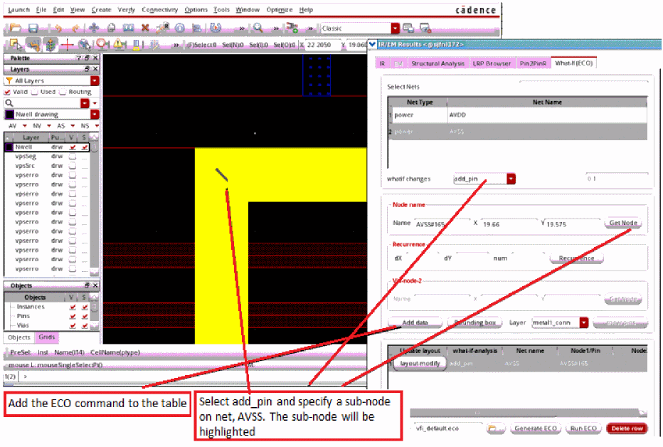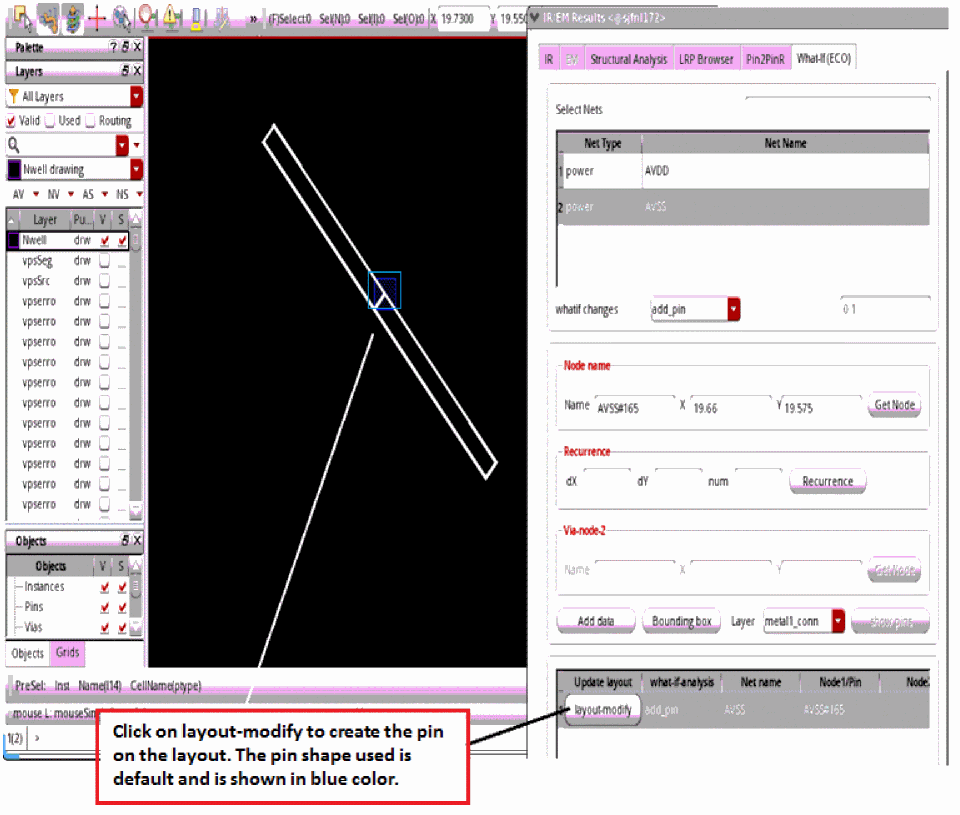 add_pin, the following flows are supported for What-If (ECO) analysis:- You can select a node by retrieving the x- and y- coordinates information in the layout. This node will be used for adding pins.