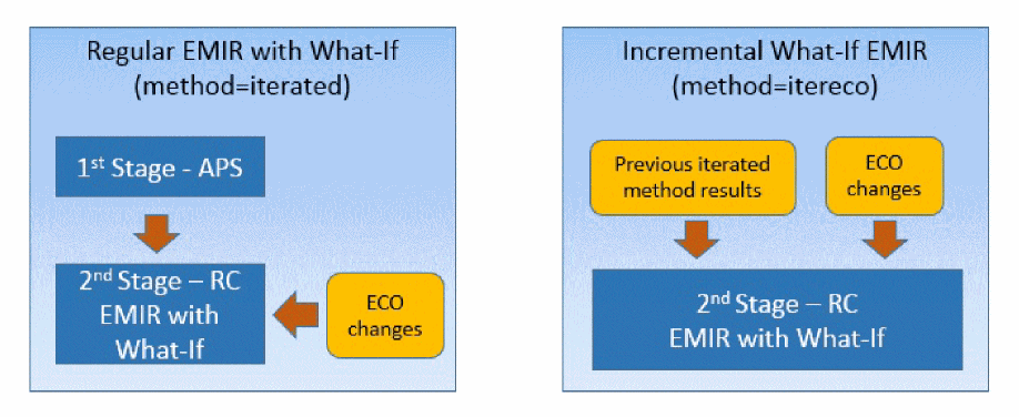 The What-If flow is supported in the regular “iterated” method EMIR flow, and in an incremental “itereco” method EMIR flow, which reuses the circuit simulation results from a previous iterated mode EMIR analysis. This is shown in the figure below.