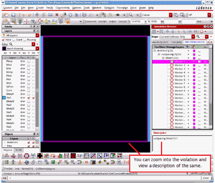 Design rules are checked during layout modifications. Virtuoso XL DRD (Design-Rule-Driven) editing is automatically turned ON by Voltus-Fi while performing the layout modifications. The violations can be viewed in Annotation Browser and the layout window.